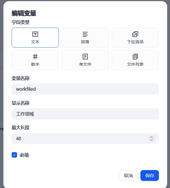 工作领域变量:文本——变量名称-wordfiled——显示名称-工作领域