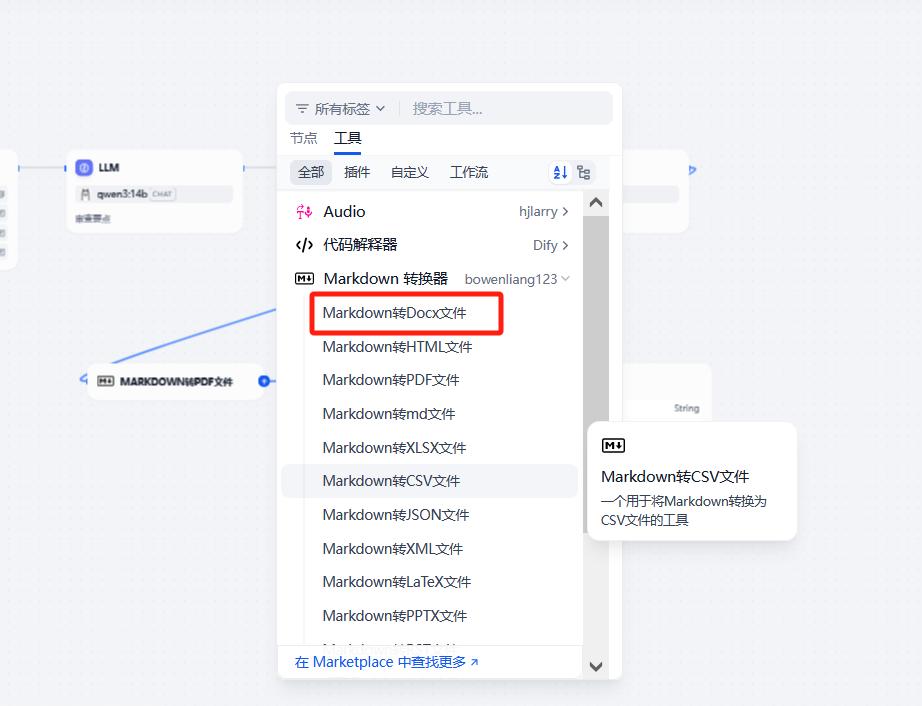 添加下一个节点,选择工具——markdown转换为pdf节点: