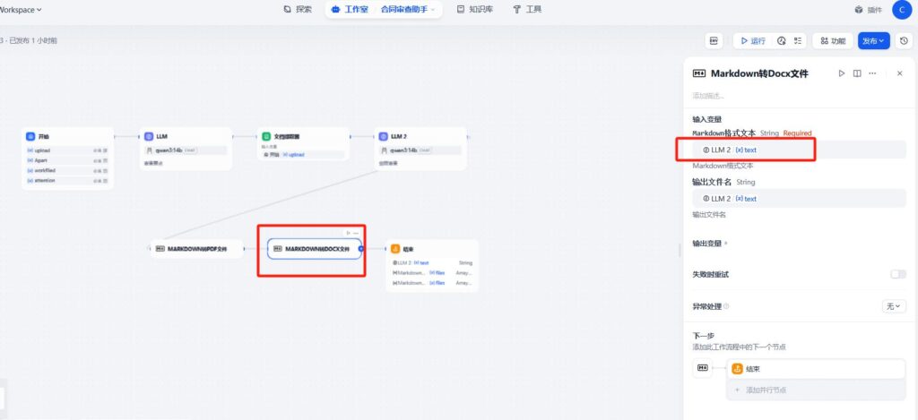 添加转换为word节点——工具,markdown ,选择转换为word类型: