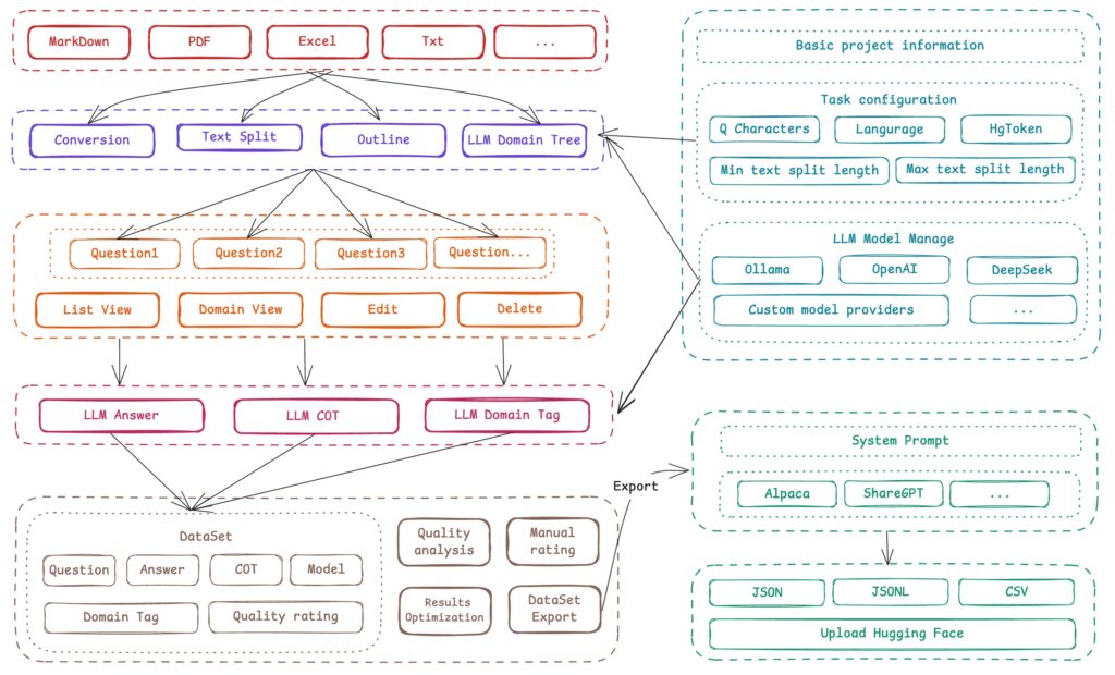 在大语言模型(LLM)微调的赛道上,“数据” 始终是绕不开的核心。无论是通用模型的垂直化适配,还是领域知识的定向注入,高质量、结构化的训练数据往往决定了模型最终的表现。但手动构建这样的数据集,却常被从业者戏称为 “体力活”—— 从文本清洗、内容分割,到问题生成、答案标注,每一步都需要大量时间与精力。