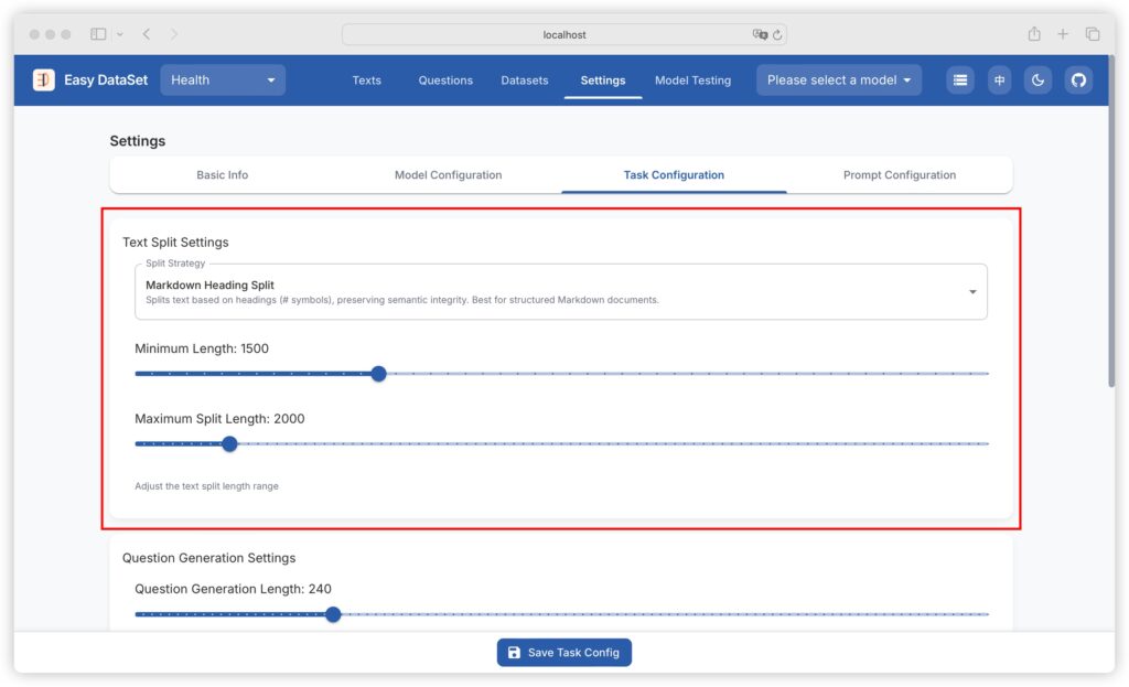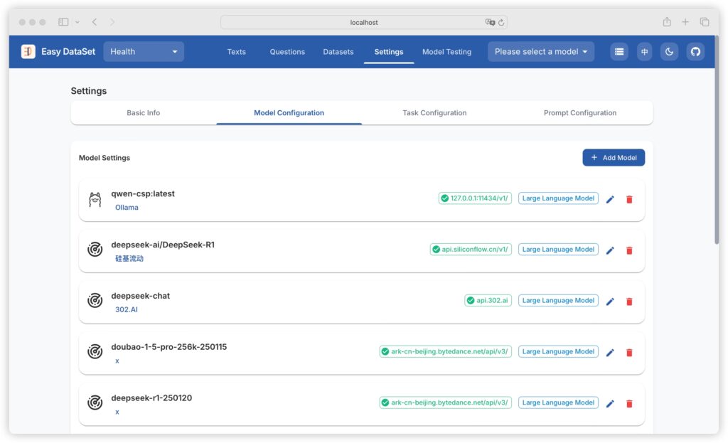 Easy Dataset 的定位非常明确:为 LLM 微调提供 “一站式数据集创建服务”。其界面设计简洁直观,即使是新手也能快速上手。我们以 “医疗领域知识微调” 为例,演示其核心流程: