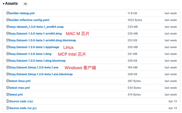 可以直接到 https://github.com/ConardLi/easy-dataset/releases 下载适合自己系统的安装包: