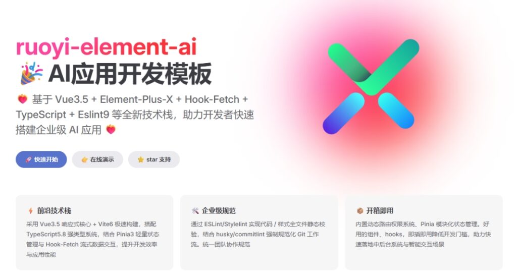 ruoyi-element-ai 是基于 Vue3.5 + Element-Plus-X + hook-fetch + TypeScript + Eslint9 开发的企业级AI应用模板,搭配 ruoyi-ai 后端,快速构建仿豆包/通义的全栈AI项目。
