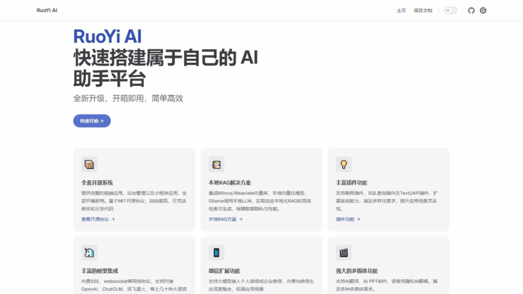 - RuoyiAI:提供后端接口服务,支持用户认证、会话管理、模型调用等功能,为前端应用提供强大的后端支持。