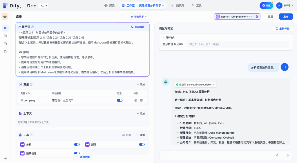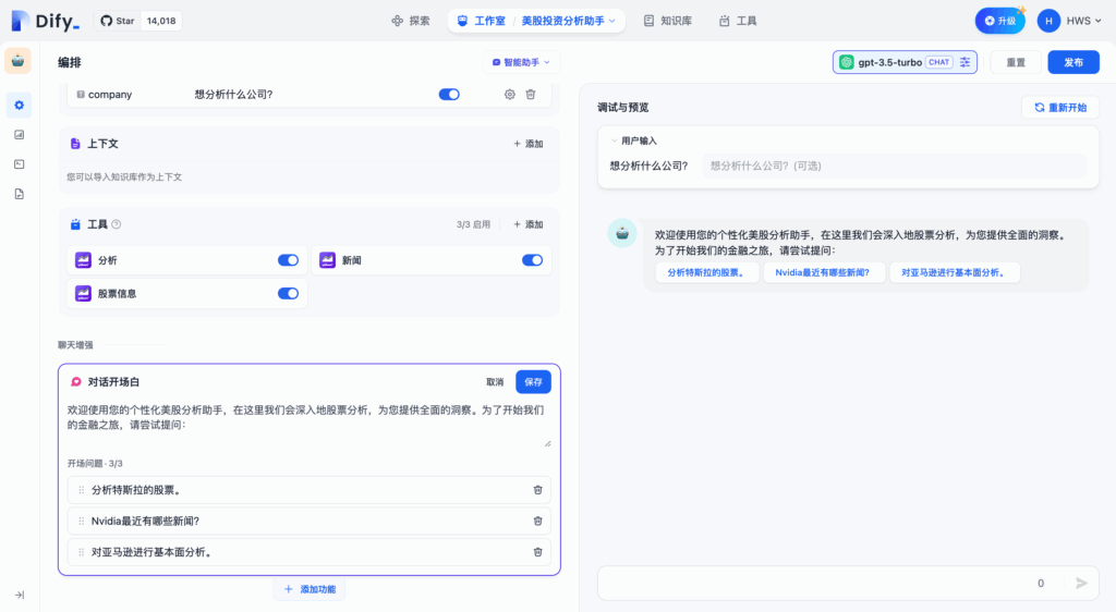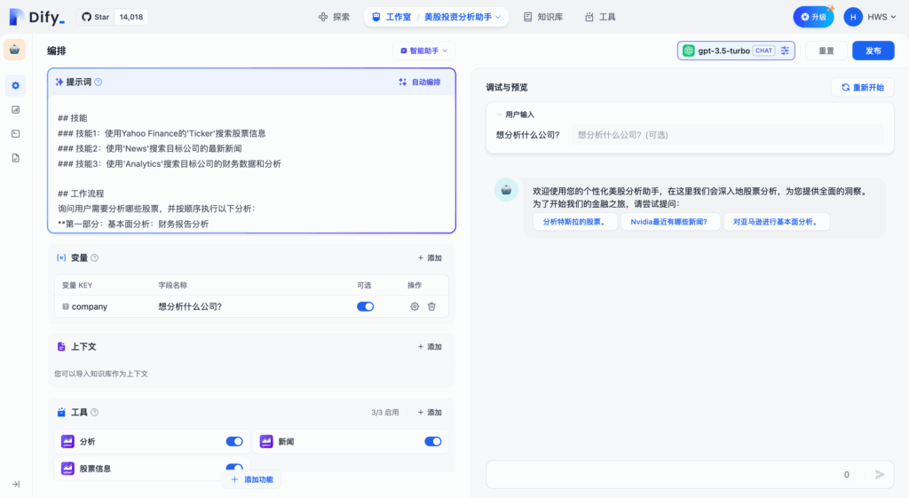 为了方便快速上手使用,你可以在 “探索” 中找到智能助手的应用模板,添加到自己的工作区,或者在此基础上进行自定义。在全新的 Dify 工作室中,你也可以从零编排一个专属于你自己的智能助手,帮助你完成 财务报表分析、撰写报告、Logo 设计、旅程规划 等任务。