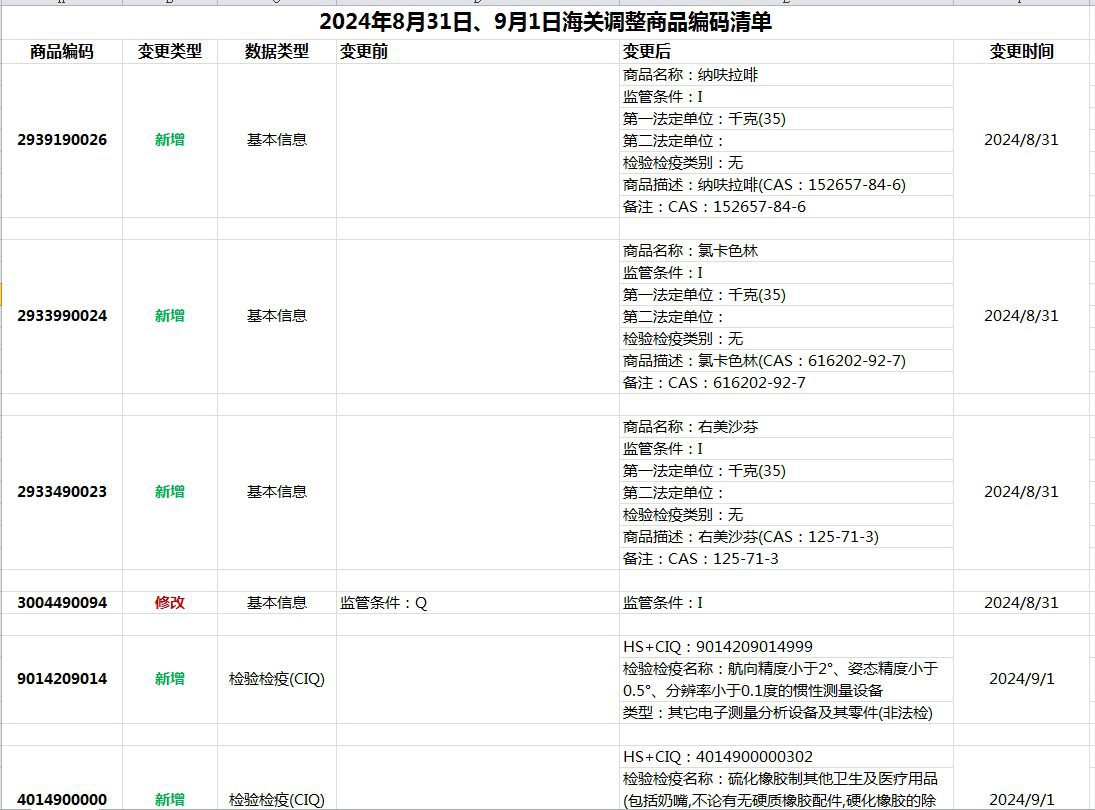 2024年8月31日、9月1日海关调整商品编码清单,海关商品编码调整清单(2024.8.31、2024.9.1),请登录后下载excel版本。