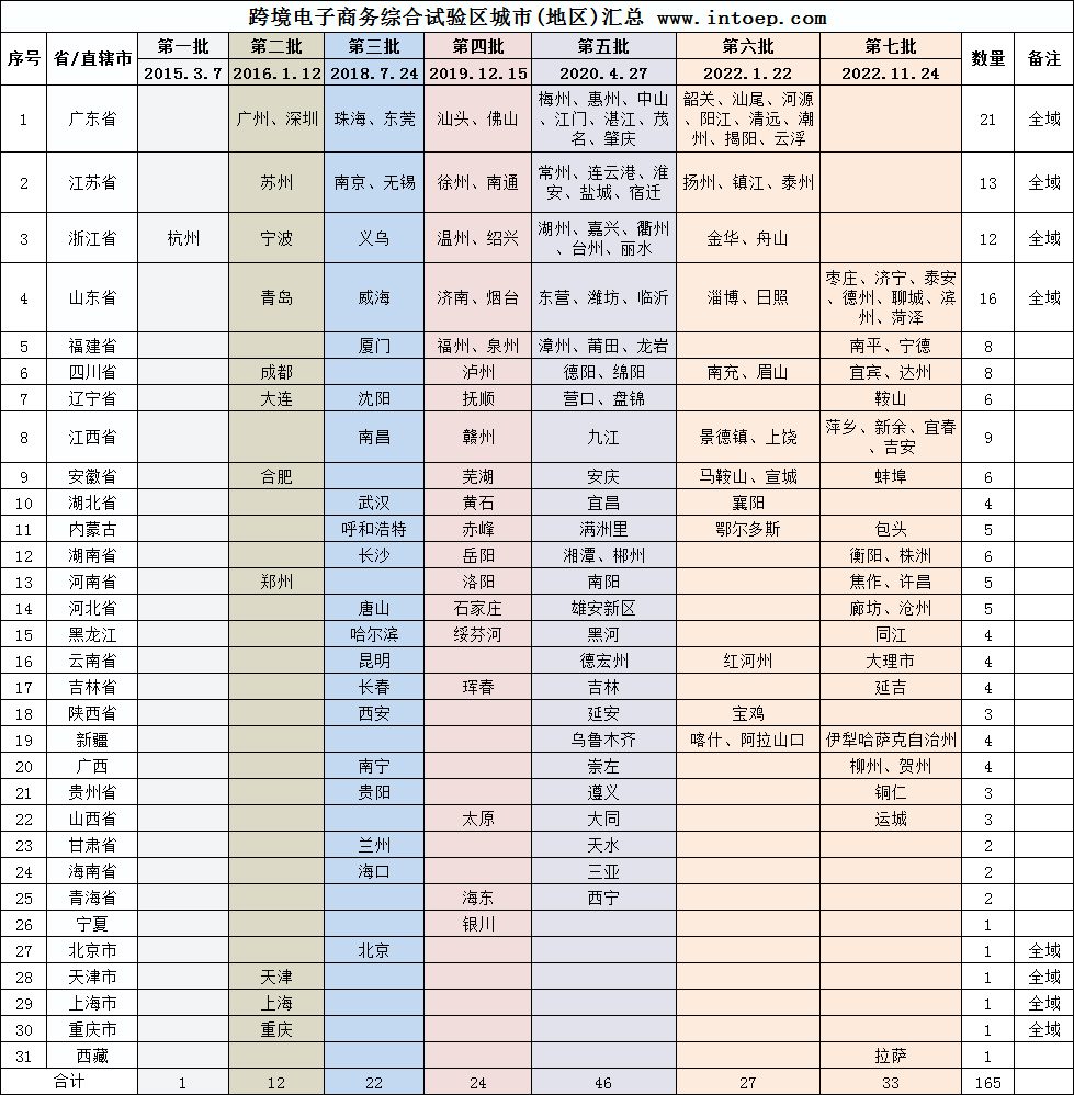 从2015年首个跨境综试区城市的设立,历经8年,逐步扩大七批次跨境综试区城市(区域),从全国1个跨境综试区城市,到现在165个跨境综试区城市(区域)。