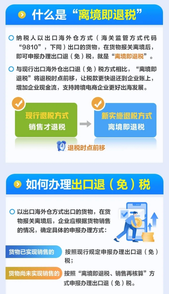 根据公告,纳税人以出口海外仓方式(海关监管方式代码“9810”)出口的货物,在货物报关离境后,即可申报办理出口退(免)税。纳税人在办理出口退(免)税申报时,货物已实现销售的,按照现行规定申报办理出口退(免)税;货物尚未实现销售的,按照“离境即退税、销售再核算”方式申报办理出口退(免)税,即:在货物报关离境后,即可预先申报办理出口退(免)税,后续再根据货物销售情况进行税款核算。