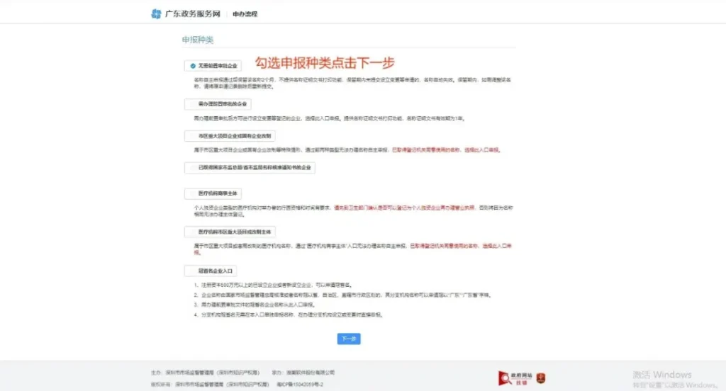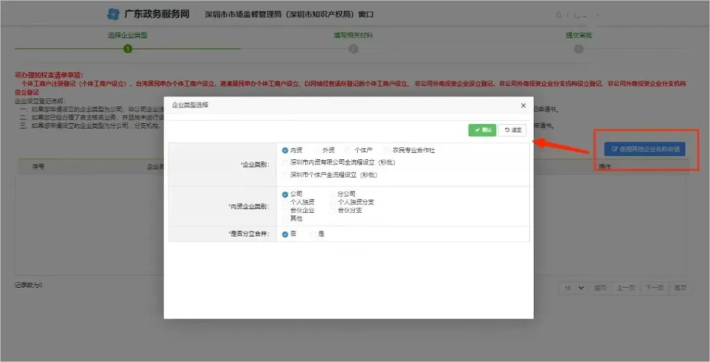 登录平台后,在新页面点击“使用其他企业名称申请”,选择企业类型,点击“确认”,