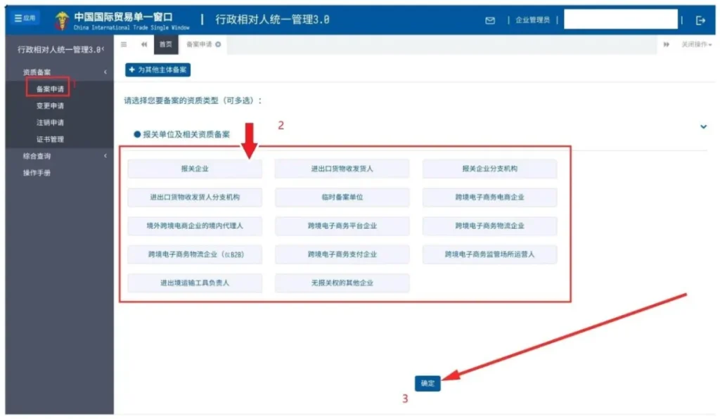 按下图序依次点击,选择报关单位相关资质备案中的“报关企业”,进入备案申请材料填报页面。