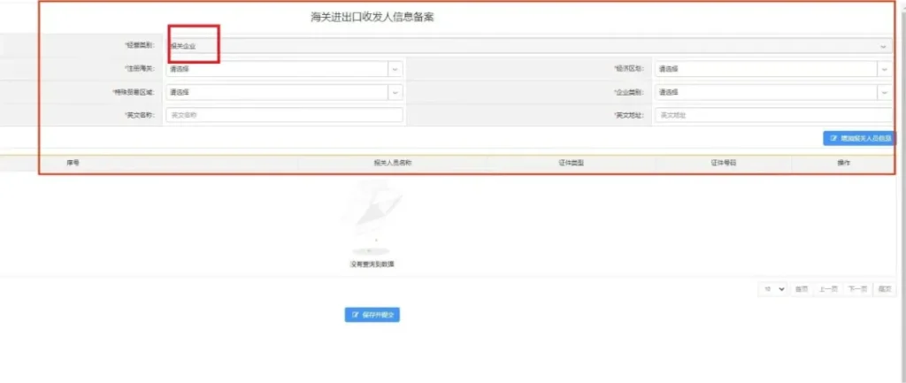 进入填写海关进出口收发货人备案信息栏目,下拉选择“报关企业”,