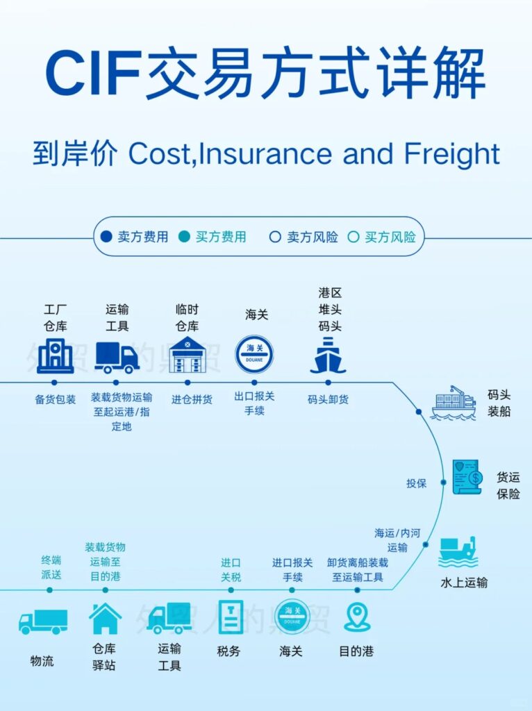 - CIF价格 = 货物成本 + 国内运输费 + 出口清关费 + 海运费 + 保险费