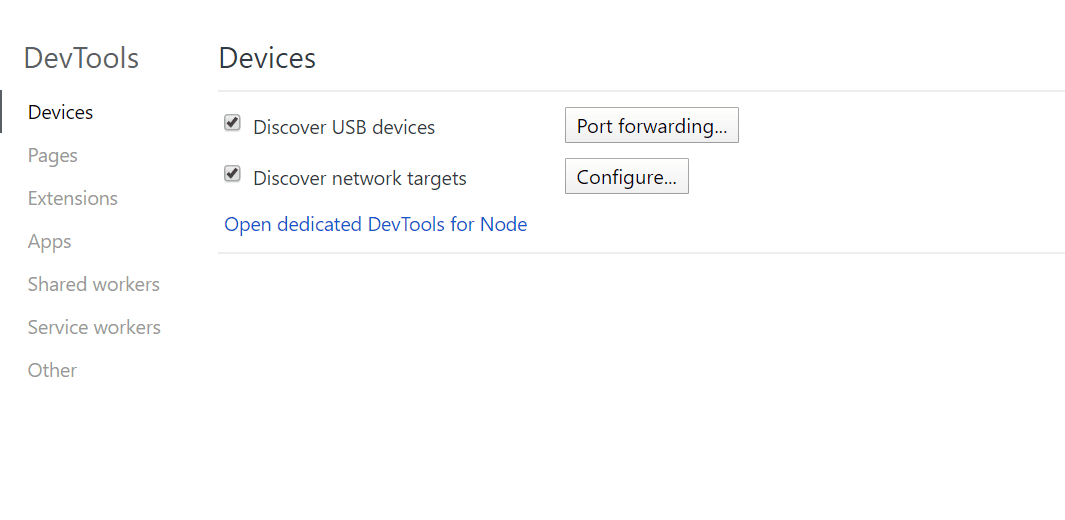 输入chrome://inspect ,打开以后,默认勾选了USB调试和网络调试。
