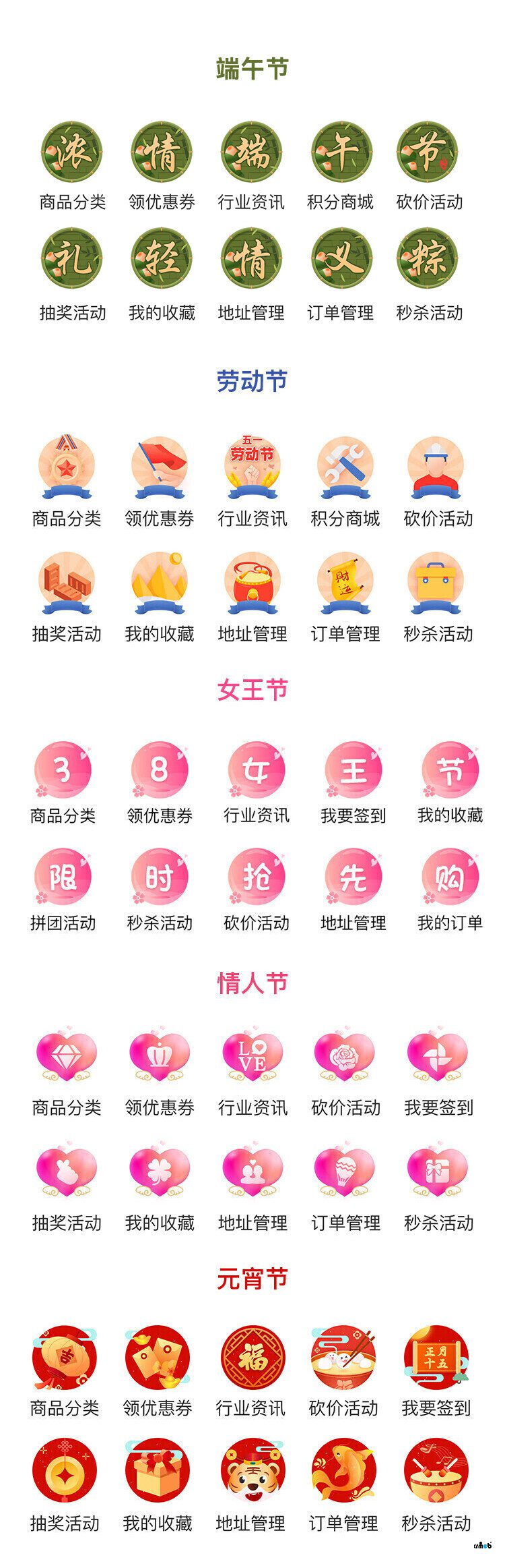 节日图标素材包来辅助大家的商城运营活动。小程序、H5、APP端使用。