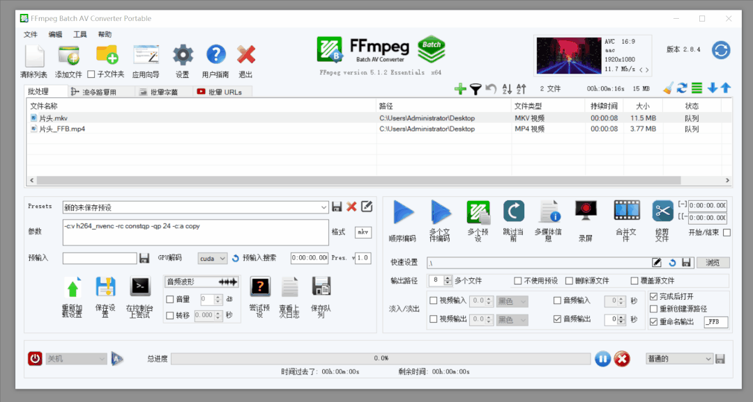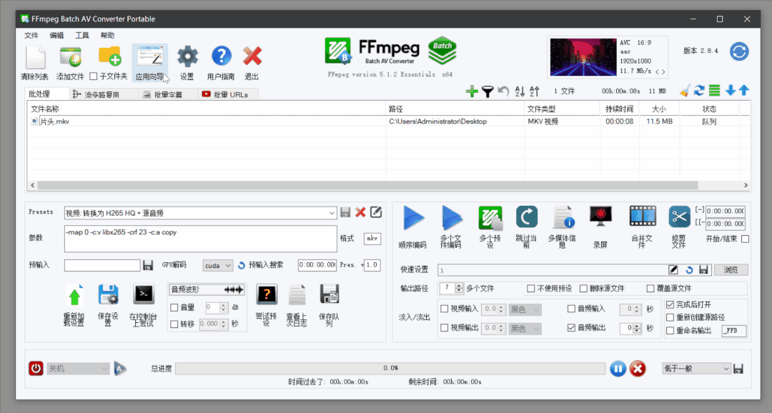 它可以用来修剪与合并视频、下载M3U8和油管的视频、查看多媒体文件的详细信息、软件支持的格式有很多:AV1 / H264 / H265 / NVENC / QuickSync / ProRes / VP9 / ffmpeg支持的任何其他视频格式,支持几千个文件批量处理、处理完自动关机、自定义GPU解码、可以使用预设向导等等。