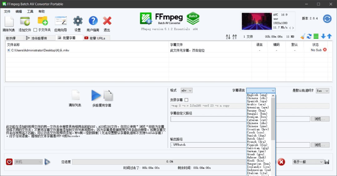 今天体验的这款工具,就是 FFmpeg 带有界面的第三方版本-FFmpeg Batch AV Converter,它可以一定程度上改善普通玩家的体验,软件是便携版本的,下载后直接解压,选择中文界面即可。