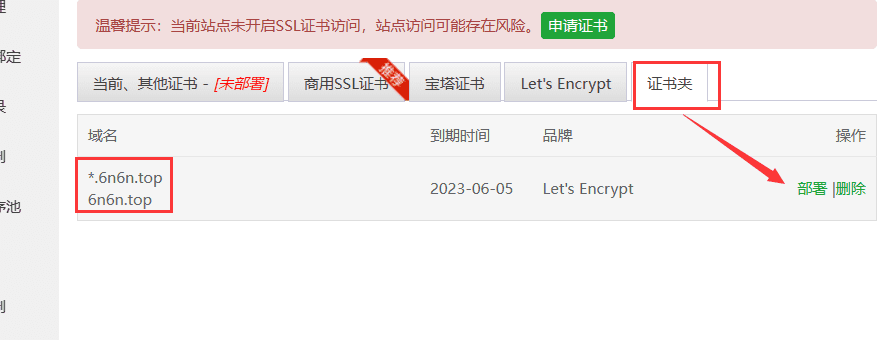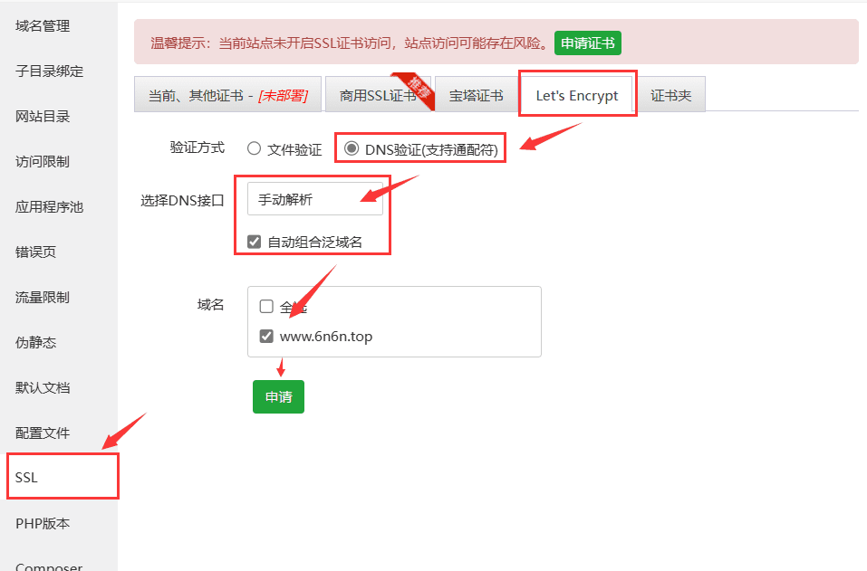 第一步:打开站点设置,找到SSL->Let’s Encrypt,按照图中的选择,点击申请