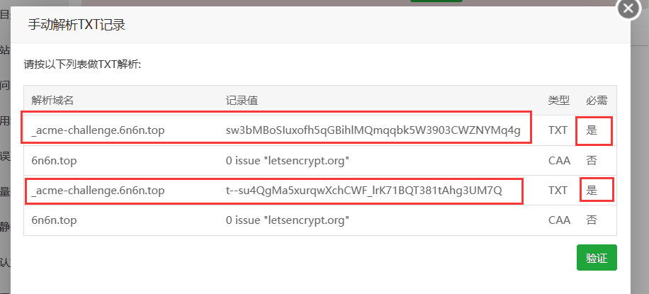 第二步:将标有“是”的记录,在域名解析的地方,做TXT解析