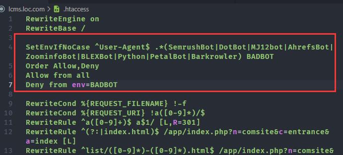 SetEnvIfNoCase ^User-Agent$ .*(SemrushBot|DotBot|MJ12bot|AhrefsBot|ZoominfoBot|BLEXBot|Python|PetalBot|Barkrowler) BADBOT Order Allow,Deny Allow from all Deny from env=BADBOT
