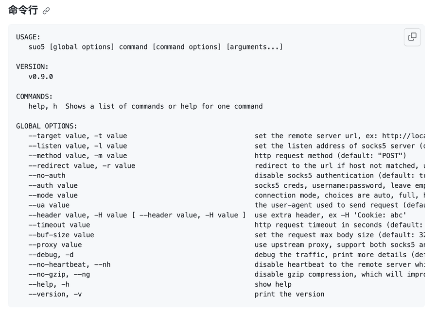 使用时需要上传 suo5.jsp 到目标环境中并确保可以执行。命令行版本与界面版配置完全一致,你可以根据界面版的功能来使用命令行版。例如,最简单的只需指定连接目标,就可以使用 GET 方法发送请求,有时可以绕过限制。你还可以自定义 socks5 监听在 0.0.0.0:7788,并自定义认证信息为 test:test123。