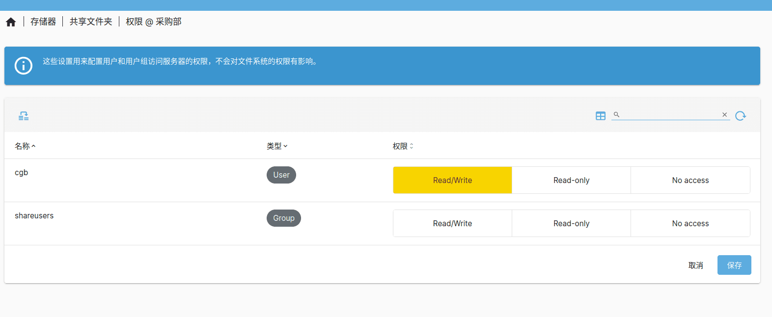 创建“共享文件”,登录的用户都有读写权限,“采购部”只有管理员有读写权限: