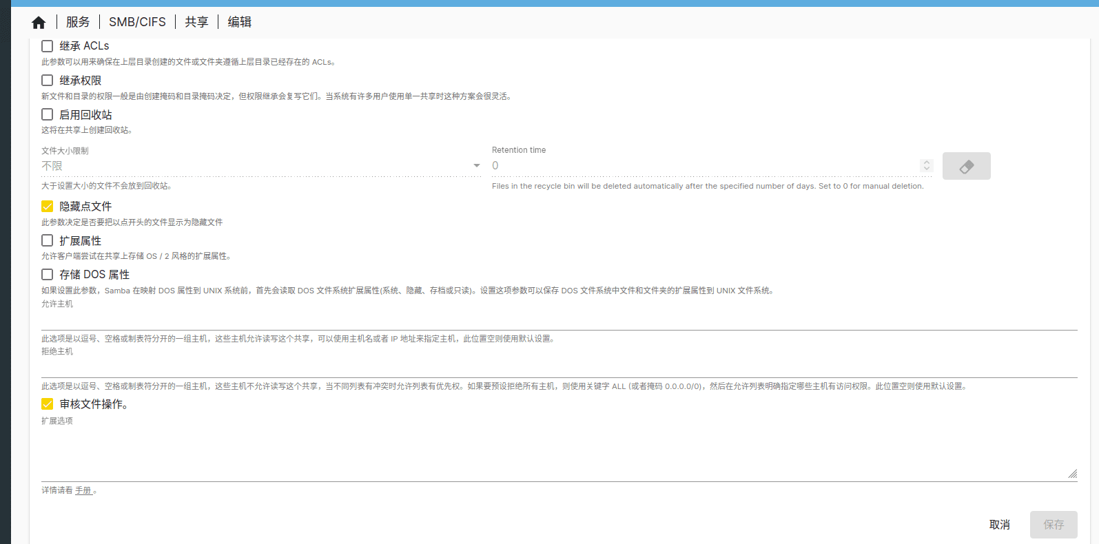 在服务–SMB–共享,把前面创建的共享文件夹选中: