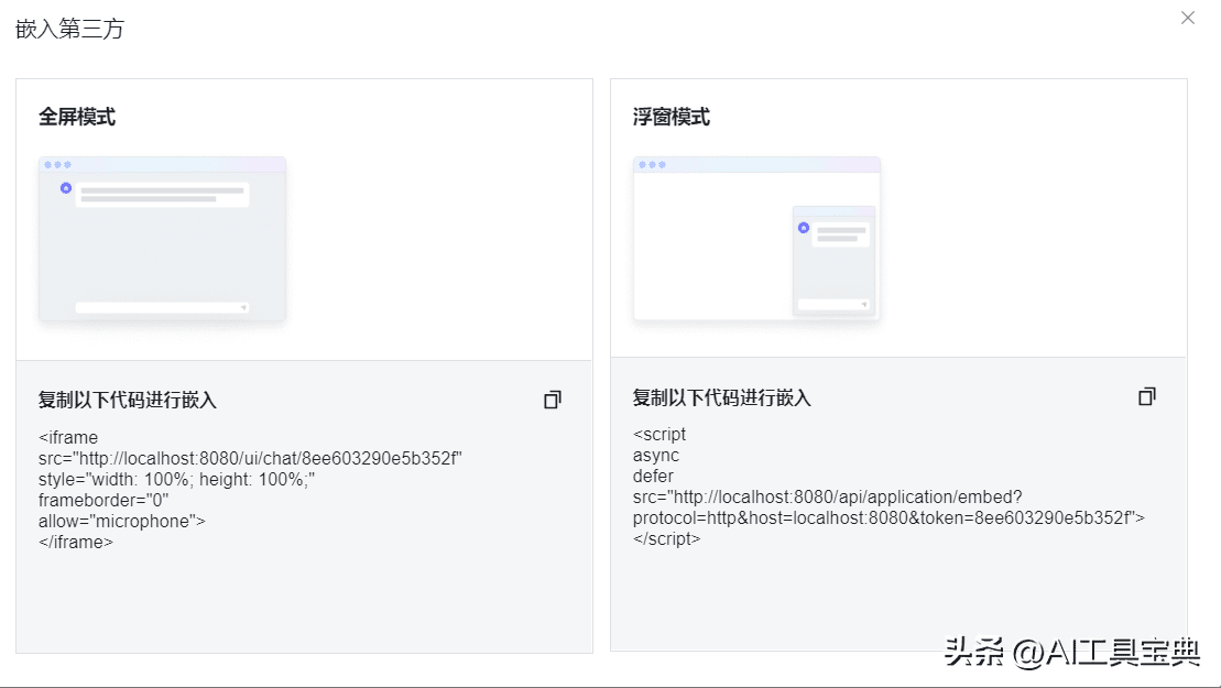 点击“嵌入第三方”,有2种选择。一个是全屏模式,一个是浮窗模式。复制到第三方的网页代码中即可使用。