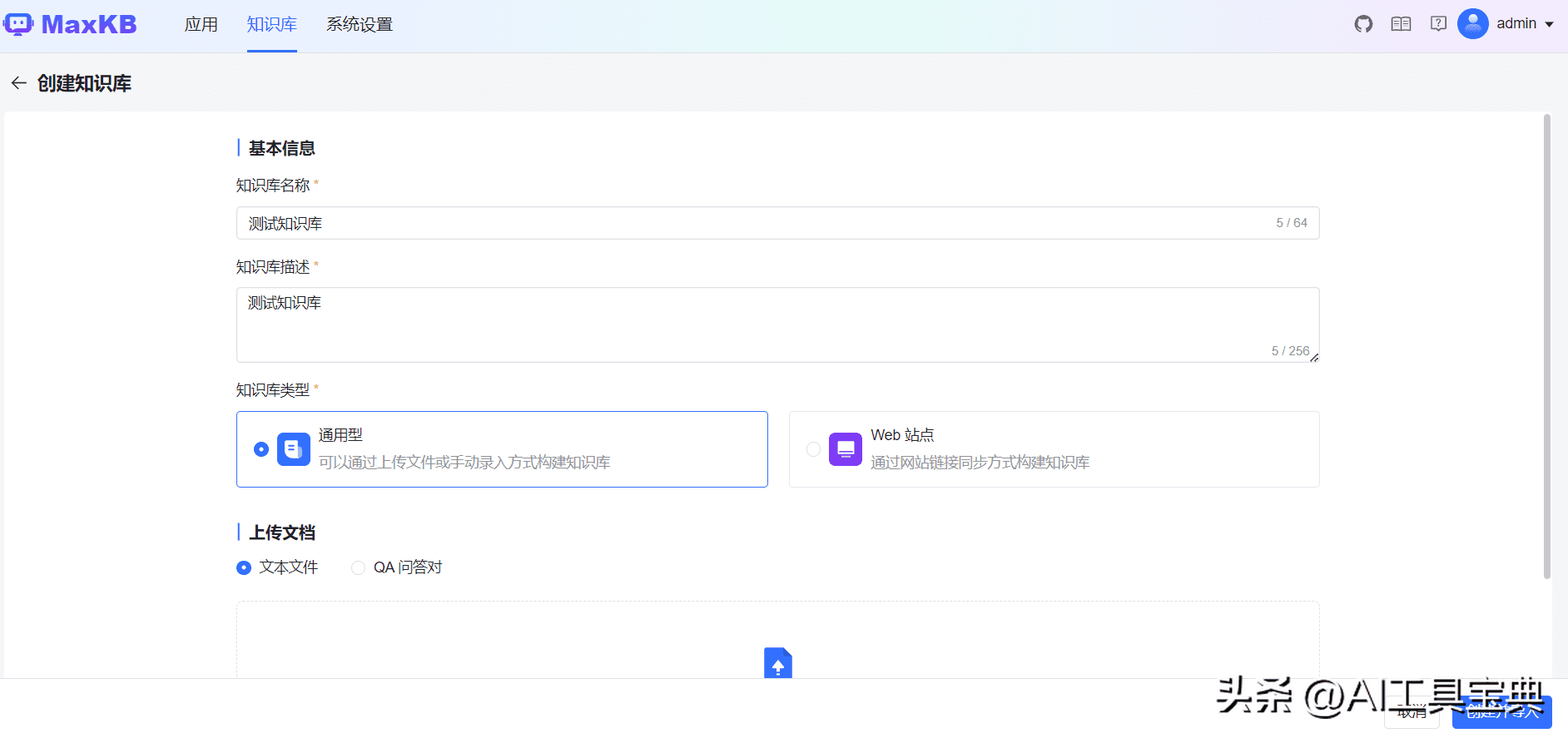 然后创建知识库,知识库支持文档和网页链接。创建问答应用并关联对应的知识库。设置大语言模型。
