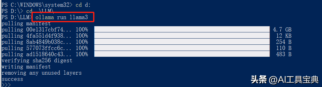 在Windows PowerShell命令行中,运行对应的下载命令,例如我下载 llama3