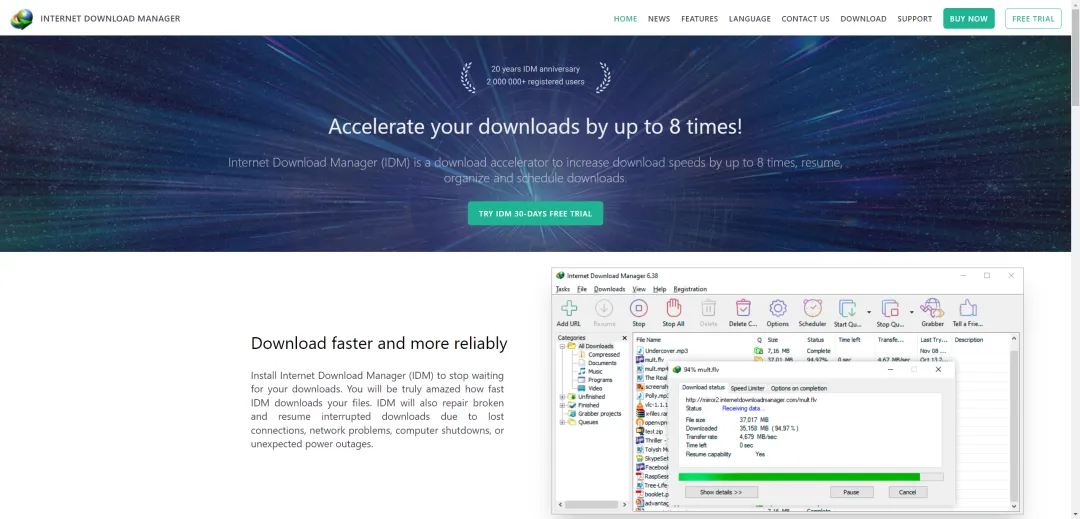 与其他下载加速器和管理器不同,IDM是在下载过程中动态分割下载的文件,可将下载速度提高多达5倍。