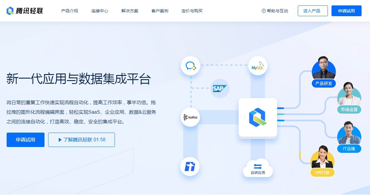 腾讯轻联,新一代应用与数据集成平台。快速连接日常办公应用,轻松实现工作流程自动化,高效打通跨部门业务数据。500+ 应用能力,海量应用满足您需求。200+ 模板数量涵盖 8 大职能、6 大工作场景,腾讯轻联在工业、教育、互联网、传媒、零售、医疗等领域的典型客户案例,查看更多应用与数据集成最佳实践,平台整理出的各个种类的自动化解决方案,从简单到复杂,从场景、职能到行业。帮助您更好的使用和了解产品。