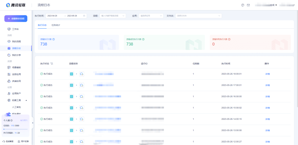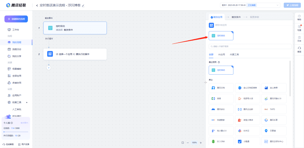 配置好相关参数后即可上线流程,腾讯轻联有不同的套餐版本,免费版以及收费版不同之处详见:应用与数据集成收费标准 – 腾讯轻联 (tencent.com)