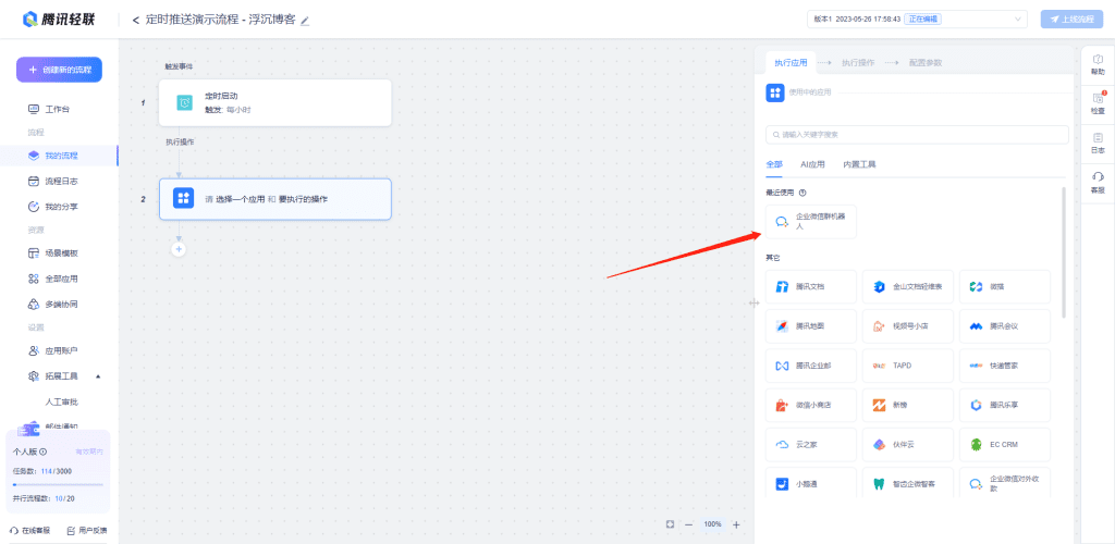 我们就以腾讯轻联的企业微信群机器人定时推送消息为例,因为我工作中常用到的就是定时推送消息,其他玩法请自行探索