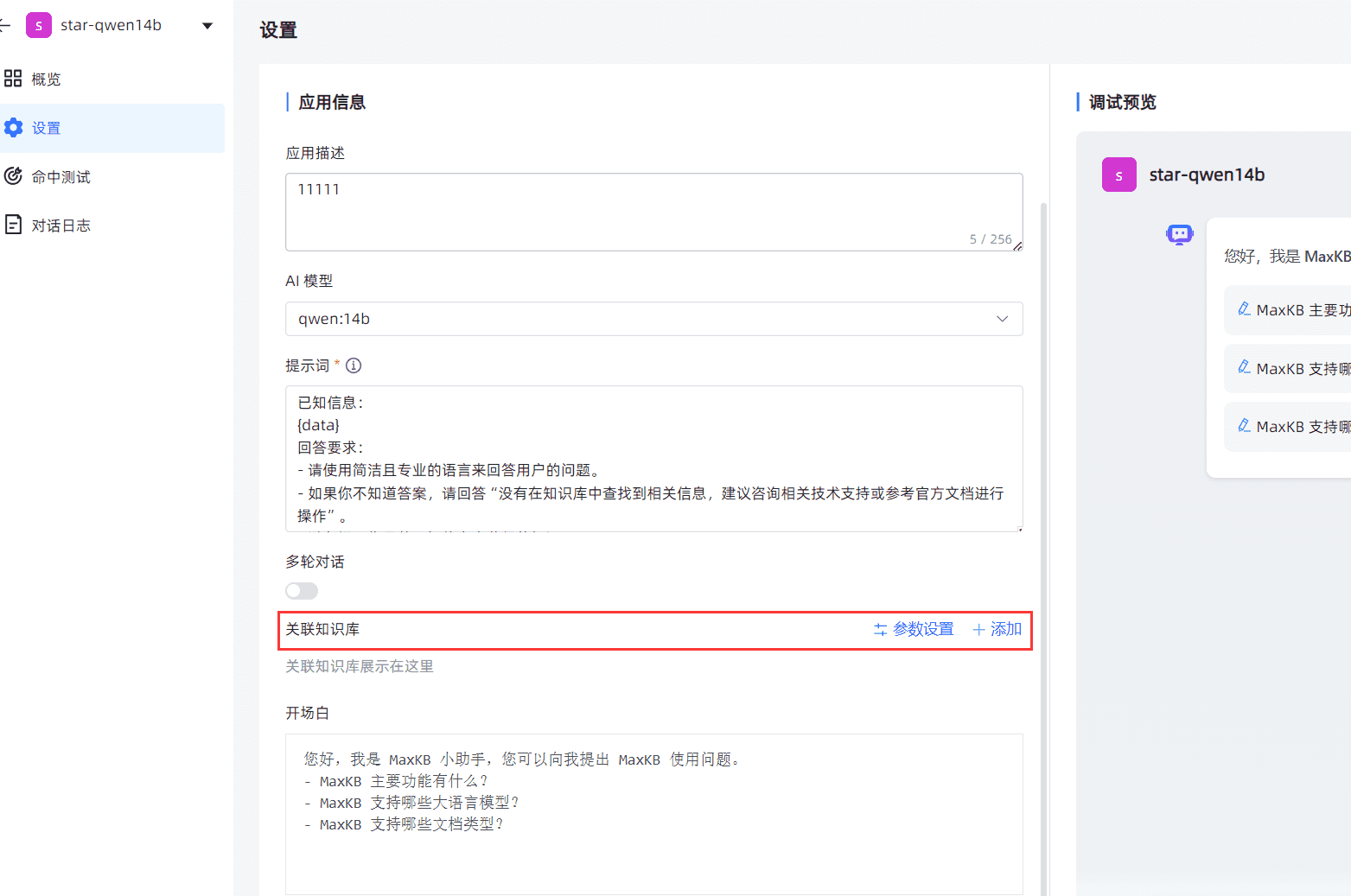 在MaxKB应用界面中,点击“知识库”菜单,选择创建知识库,填写相关信息后创建并导入知识库。在“知识库类型”选项中,离线文档选择“通用型”类型,在线文档选择“Web站点”类型。知识库创建界面如下: