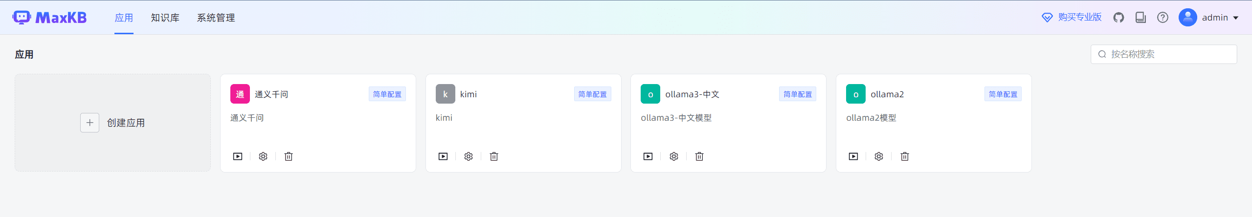 如下图,进入后台之后有“应用”,“知识库”,“系统管理”三大主要功能。