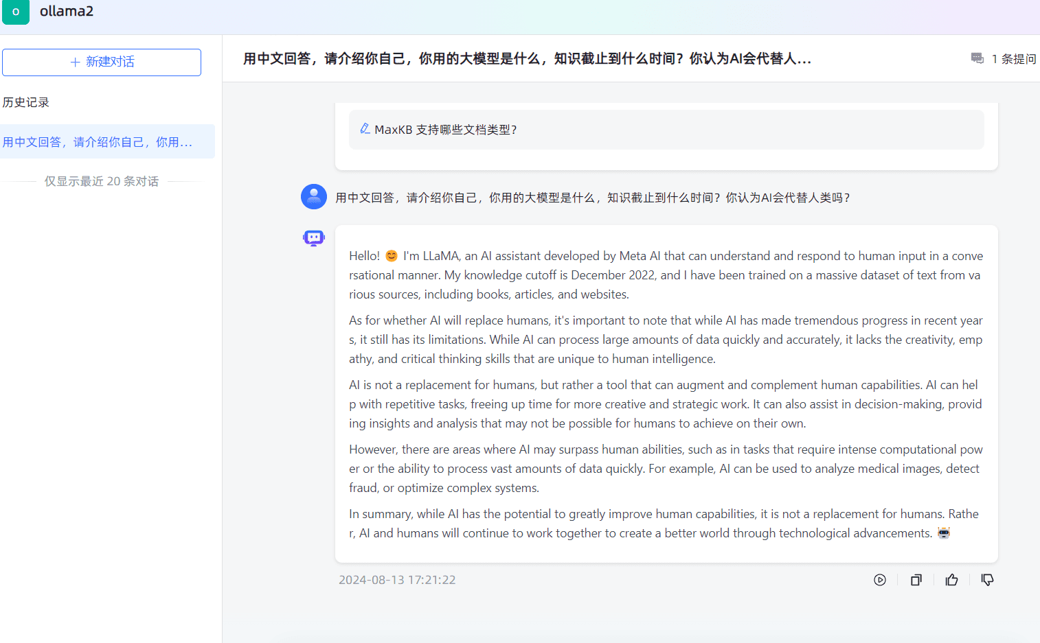 MaxKB还支持与以Ollama为代表的本地私有大模型相结合,快速部署本地的知识库问答系统。