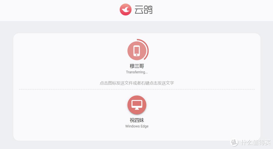 点击对方设备图标,即可向对方传输文件。如果需要发送文字内容,可以右键点击图标(手机端长按图标)发送文字。
