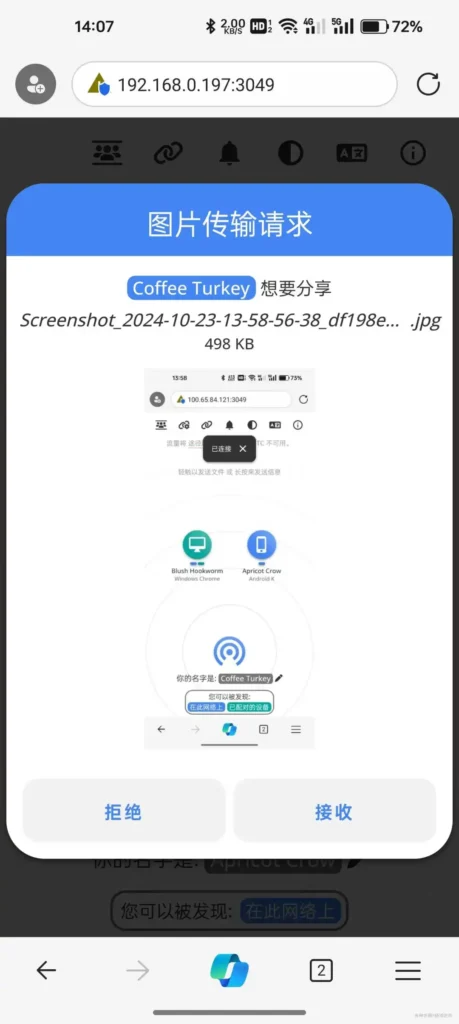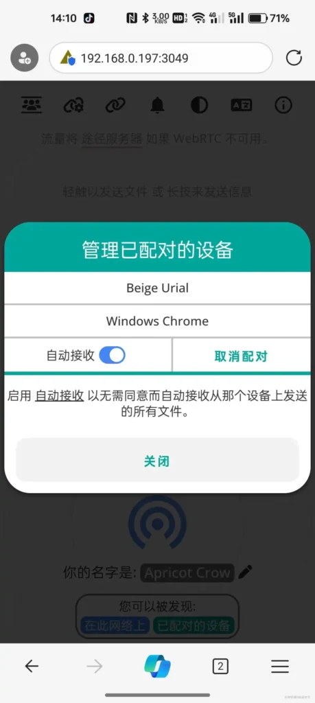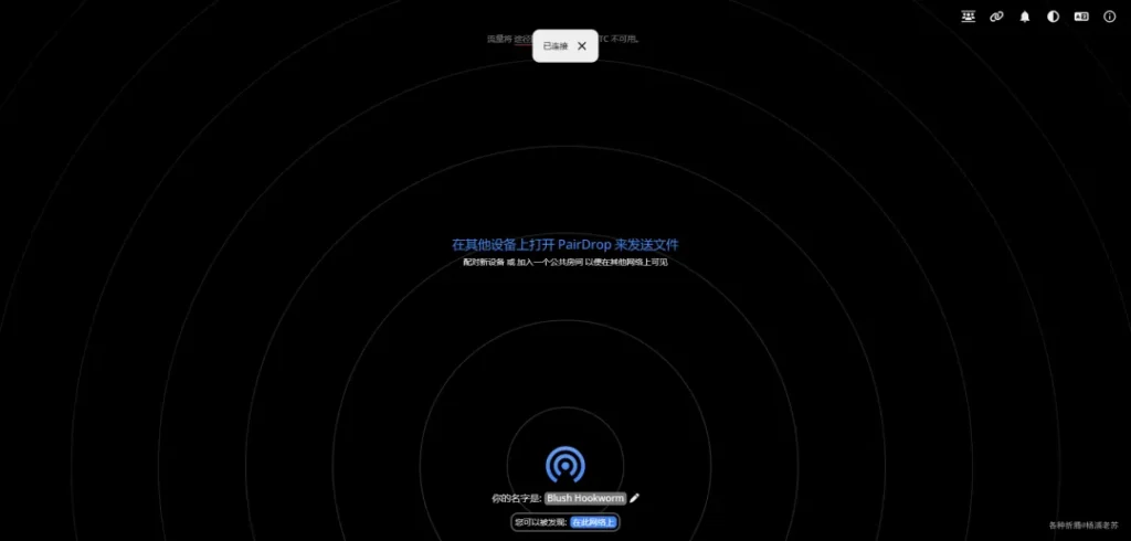 - 零配置启动: 访问网页 https://pairdrop.net 或私有部署地址,设备自动加入同一传输网络。