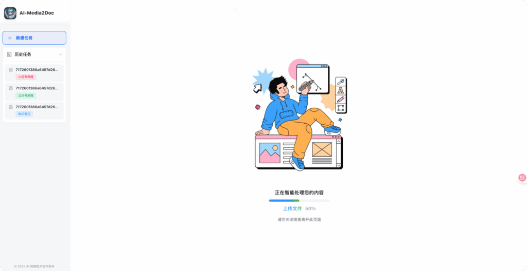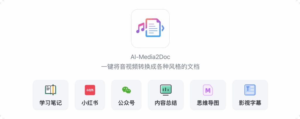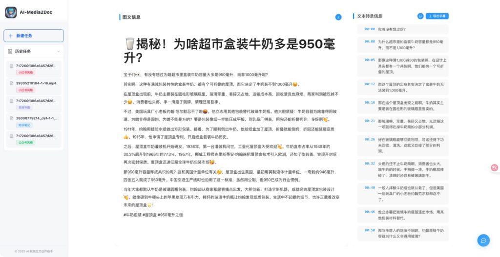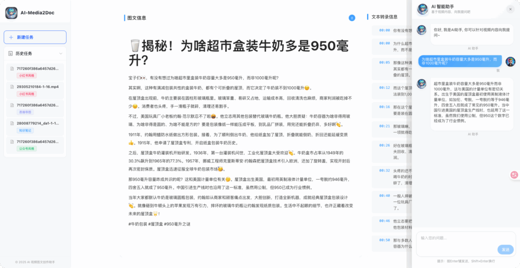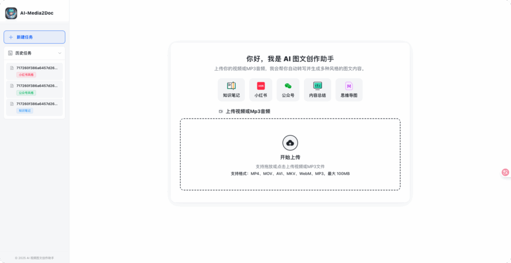 AI 视频图文创作助手是一款Web工具,基于AI大模型, 一键将视频和音频转化为各种风格的文档,无需登录注册, 前后端本地部署,以极低的成本体验 AI 视频/音频转风格文档服务。