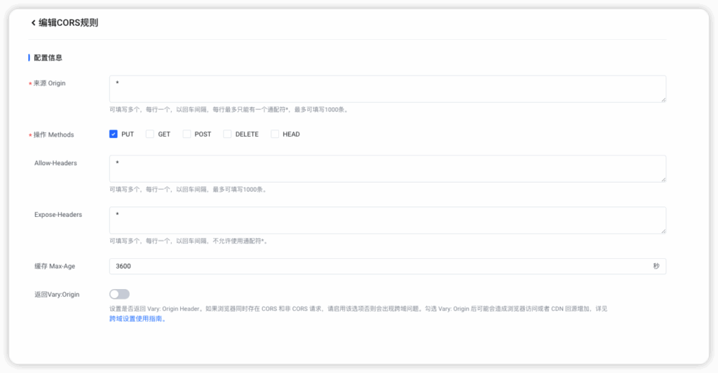 登录 对象存储控制台 创建一个 bucket, 创建完毕之后进入该 bucket。点击右侧权限管理, 找到跨域访问设置, 新建一条跨域访问规则。