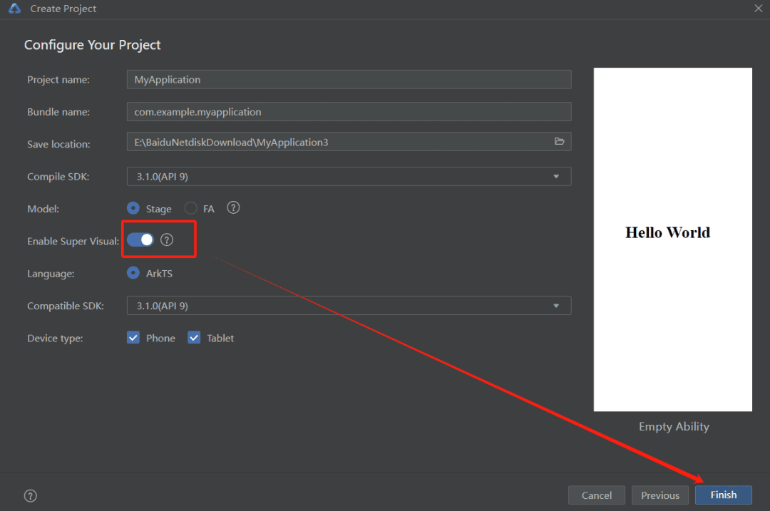 新建项目—空文件—开Enable super visual—finish