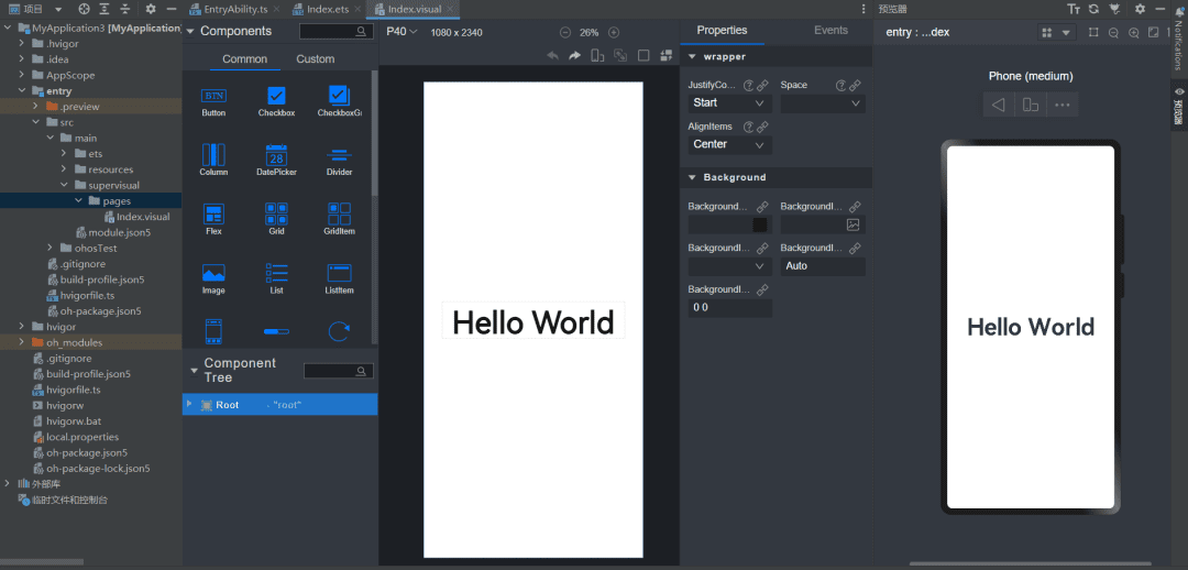 鸿蒙开发有多种开发模式,一种是使用ArkTS声明式,如果这种感觉还需要花时间学习的话,那么另一种就是前端HTML+CSS+JS的方式,类似vue+小程序的混合语法,此外还有一种则是低代码可视化形式,拖拖拽拽低代码的形式创建页面或应用,下面一个个来看。