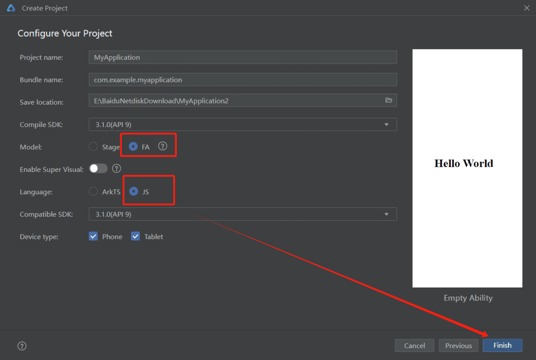 新建项目—空文件—选择FA—选择JS—finish
