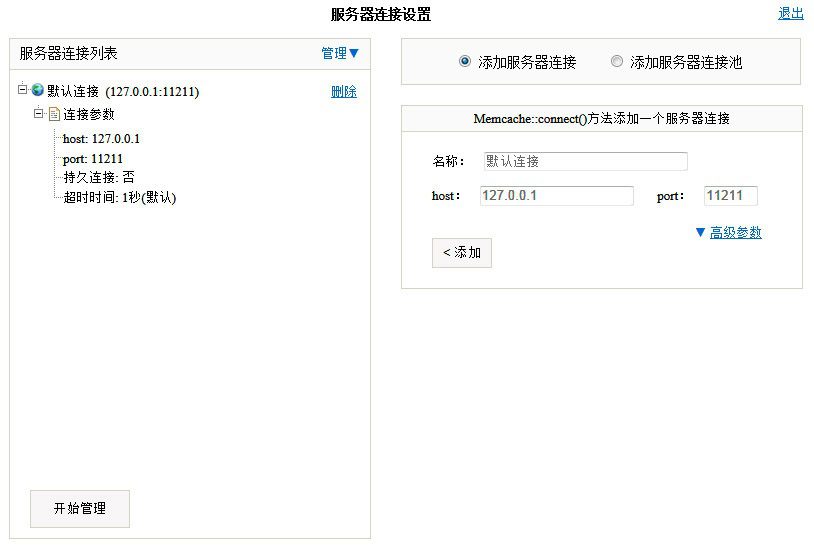 右侧添加为memcache地址和端口后,遍会进到左侧列表,之后点击上方的管理,然后点击保存管理列表,便会将列表保存到本地,有个不好的操作是,它的地址是保存在cookie 中的,更换浏览器或者cookie过期后都需要重新填写,之后点开始管理也就没什么好说的啦,相信大家都看的懂。还有一点php扩展需要安装php memcache的扩展,不支持php memcached的扩展。