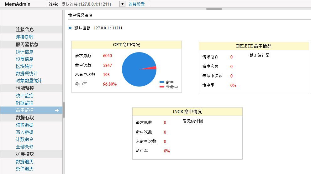 - 服务器性能监控:GET、DELETE、INCR、DECR、CAS等常用操作命中率实时监控