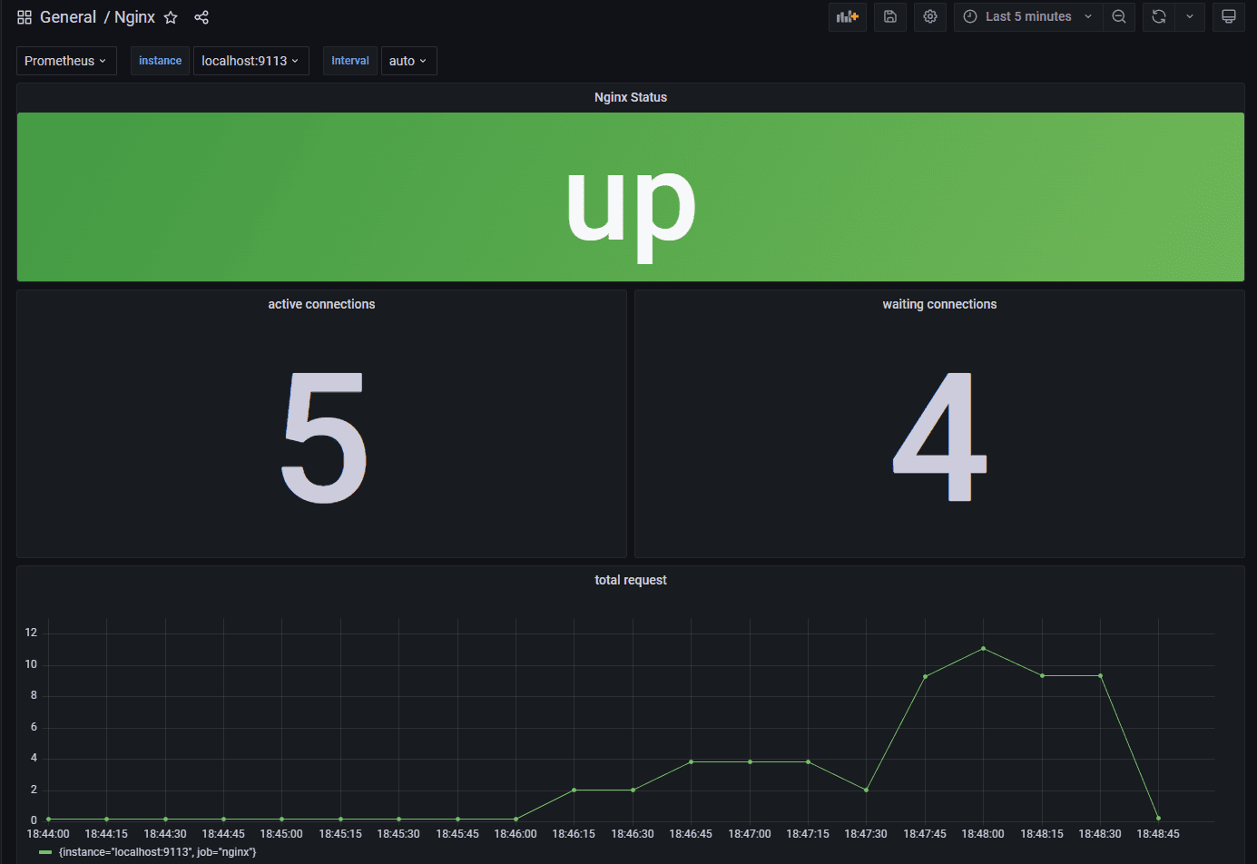 注:这里我们定义了一个名为nginx的job,采集间隔为10秒,目标地址为localhost:9113,也即是Nginx Exporter的地址端口。