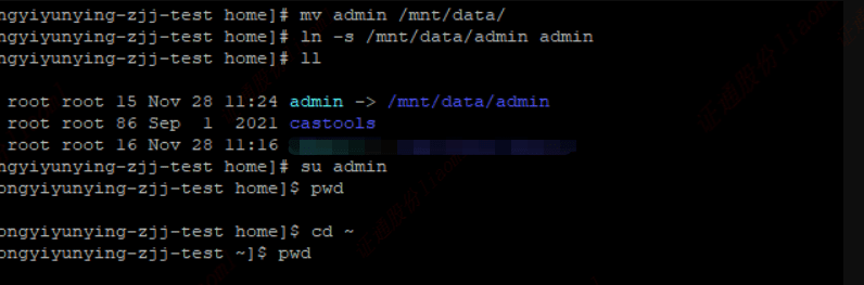 home 目录下用户全部存放与根目录下,如根磁盘空间不足,可以将 home 目录下用户目录移动至新挂载磁盘下,在 home 目录下生成挂载磁盘软链接,步骤如下:
