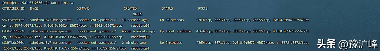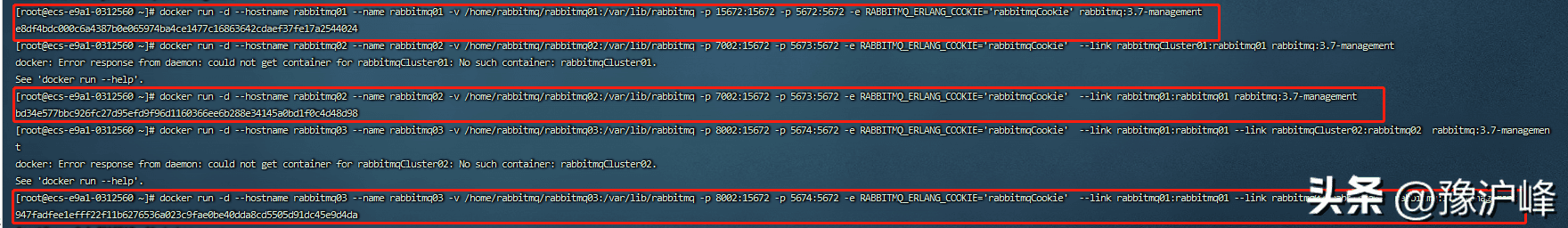 #创建RabbitMQ目录 mkdir /home/rabbitmq cd /home/rabbitmq #创建三个rabbitmq 目录,存储三个节点配置信息 mkdir rabbitmq01 rabbitmq02 rabbitmq03 #rabbitmqCluster01 主节点 docker run -d --hostname rabbitmq01 --name rabbitmq01 -v /home/rabbitmq/rabbitmq01:/var/lib/rabbitmq -p 15672:15672 -p 5672:5672 -e RABBITMQ_ERLANG_COOKIE='rabbitmqCookie' rabbitmq:3.7-management #rabbitmqCluster02 从节点 docker run -d --hostname rabbitmq02 --name rabbitmq02 -v /home/rabbitmq/rabbitmq02:/var/lib/rabbitmq -p 7002:15672 -p 5673:5672 -e RABBITMQ_ERLANG_COOKIE='rabbitmqCookie' --link rabbitmq01:rabbitmq01 rabbitmq:3.7-management #rabbitmqCluster03 从节点 docker run -d --hostname rabbitmq03 --name rabbitmq03 -v /home/rabbitmq/rabbitmq03:/var/lib/rabbitmq -p 8002:15672 -p 5674:5672 -e RABBITMQ_ERLANG_COOKIE='rabbitmqCookie' --link rabbitmq01:rabbitmq01 --link rabbitmq02:rabbitmq02 rabbitmq:3.7-management