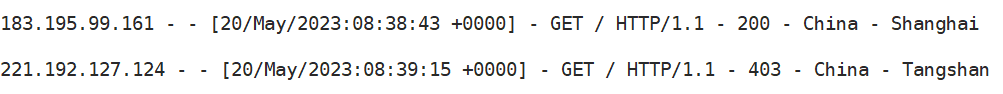 log_format geoip '$http_x_forwarded_for_temp - $remote_user [$time_local] - $request - $status - $geoip2_country_name_en - $geoip2_city_name_en';