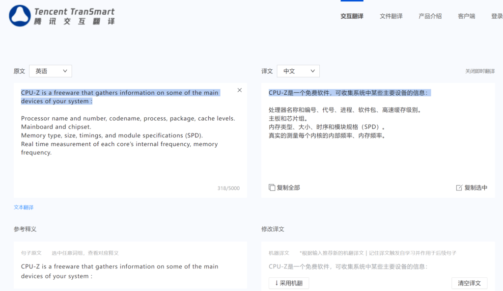 腾讯翻译提供了网页版和客户端,支持交互翻译和上传文档全文一键翻译。